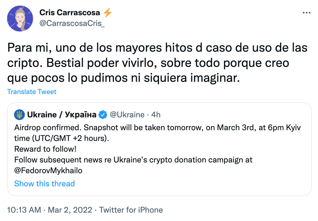Ucrania empezó aceptando las tres principales criptomonedas del mercado cripto: Bitcoin (BTC), Ethereum (ETH) y Tether (USDT). Tras el éxito, ayer añadieron también donaciones con Polkadot (DOT) y obtuvo una respuesta muy veloz y efectiva, ya que el fundador de Polkadot, Gavin Wood, llegó a donar $5 millones de dólares en DOT para la causa ucraniana.