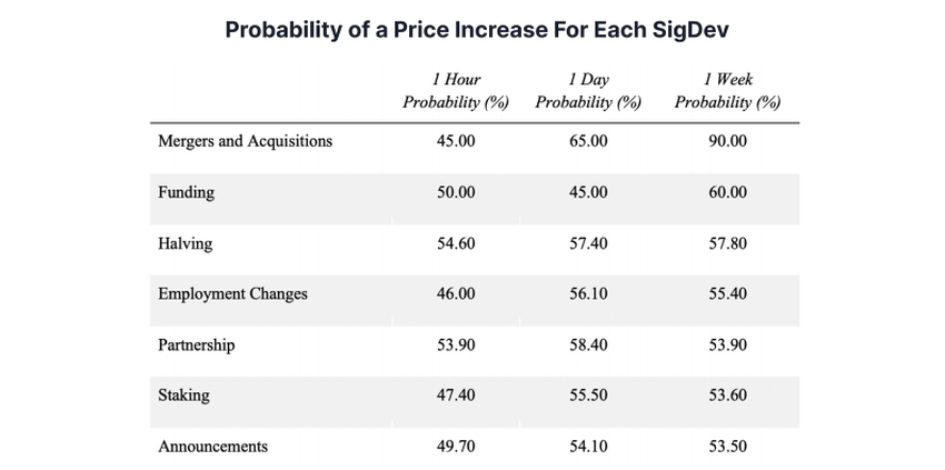 El equipo luego compiló los efectos de varios de estos SigDevs. Después de las fusiones o adquisiciones y la financiación, los lanzamientos de mainnet, los fork y los cambios de personal tuvieron el mayor impacto a lo largo de una semana. Posteriormente, el equipo calculó la probabilidad de un aumento de precio para estos avances.