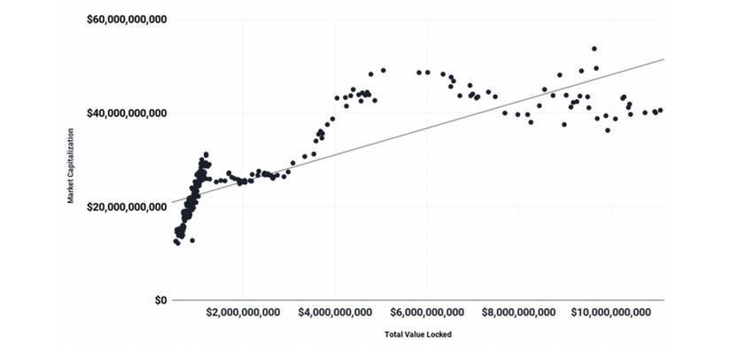 Como resultado de los nuevos protocolos y plataformas como Uniswap, eToro y TIE creen que ETH tiene un fuerte valor subyacente. Esto se debe a que las principales plataformas de DeFi requieren ETH en algún momento del proceso. Además, cita la invención de nuevos protocolos como una buena señal para la criptomoneda. Cita también una fuerte correlación entre la capitalización del mercado de Ethereum y el valor total bloqueado en DeFi como evidencia.
