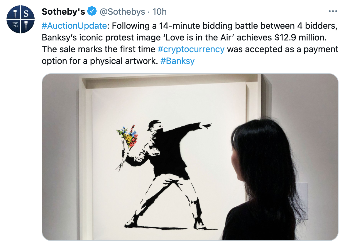 Hace apenas unas horas el 13 de mayo, la prestigiosa casa de subastas Sotheby’s confirmaba que el método de pago para la venta de la icónica obra de Banksy sería pagado de manera íntegra con criptomonedas, creando así un hito al ser la primera obra física vendida con criptomonedas.