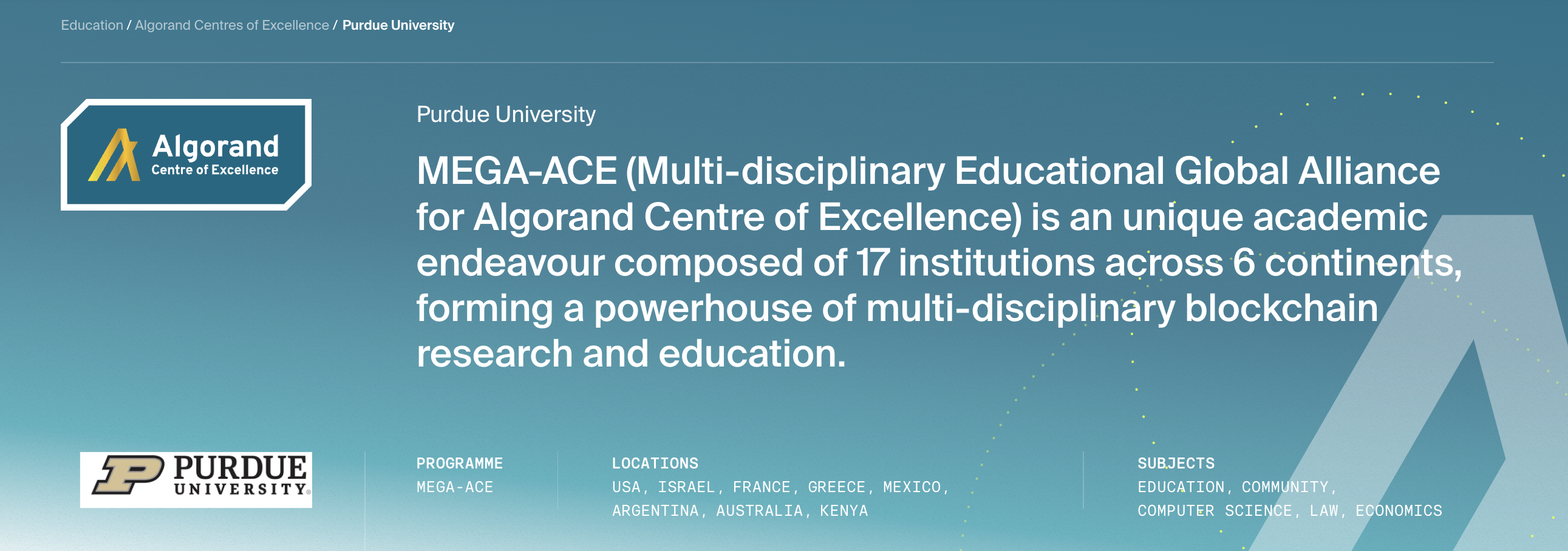 De acuerdo con Algorand, el proyecto MEGA-ACE busca capacitar a las universidades con soluciones integrales en blockchain, desde teoría fundamental hasta aplicaciones, con enfoques multidisciplinarios, economía, aplicaciones sociales, hasta criptografía y arquitectura en la blockchain de Algorand.