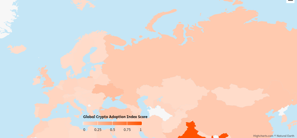 De acuerdo a los datos recientes compartidos por Chainalysis, los principales países con mayor adopción de criptomonedas en Europa (no solo en la UE) se encuentran en el Este. Estos países son: Ucrania (0.215), Turquía (0.142) y Rusia (0.140).