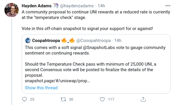 Si la encuesta de pregunta cerrada pasa con un mínimo de 25000 UNI, se publicará una segunda votación de consenso para ultimar los detalles de la propuesta. Cooper Turley de DeFi Rate, que hizo la propuesta junto a Monet Supply, miembro de la comunidad, lo explicó y dijo lo siguiente: