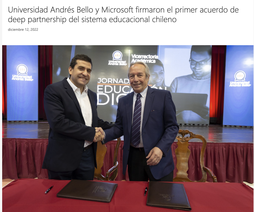 La Universidad Andrés Bello (UNAB) de Chile y Microsoft anunciaron un acuerdo de “Deep Partnership” para promover el uso de tecnologías como el metaverso, que potencien la formación de estudiantes, mediante experiencias significativas y aprendizaje activo.