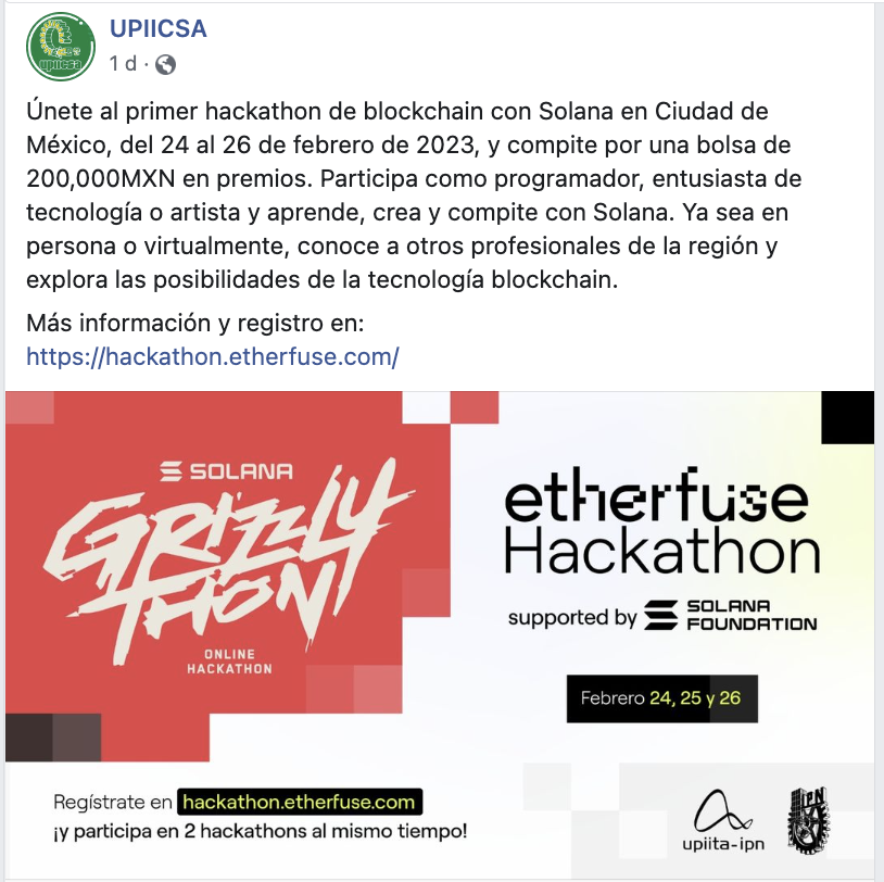 UPIICSA del Instituto Politécnico Nacional (IPN) de México y Solana anunciaron la realización de su primer hackathon en la Ciudad de México, a realizarse del 24 al 26 de febrero, y promete premios por hasta 200,000 pesos (10,000 dólares).