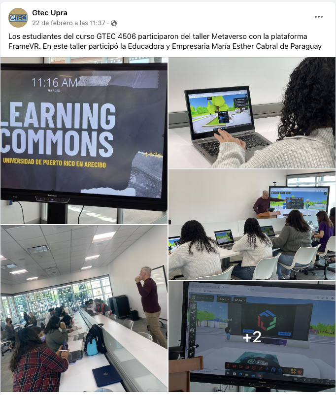 “Los estudiantes del curso GTEC 4506 participaron del taller Metaverso con la plataforma FrameVR. En este taller participó la Educadora y Empresaria María Esther Cabral de Paraguay”.