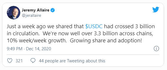 Además, USDC también está experimentando un crecimiento agresivo semana tras semana. El cofundador y director ejecutivo de Circle, Jeremy Allaire, declaró recientemente en Twitter: