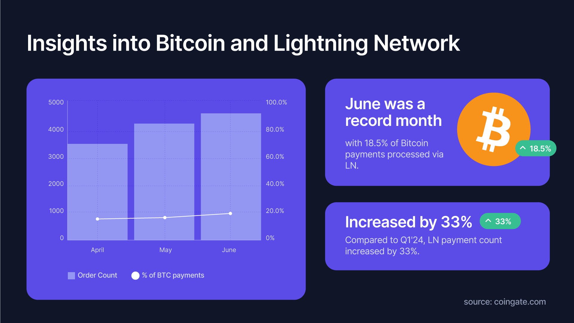 Respecto a Bitcoin, CoinGate sostuvo que los pagos con Bitcoin disminuyeron 5% en comparación con el primer trimestre, y 35% interanual. No obstante, las transacciones con Lightning Network (LN) crecieron 33% en el segundo trimestre. Además, el total de transacciones que utilizaron LN en Bitcoin en el mercado fue de 18,5%.