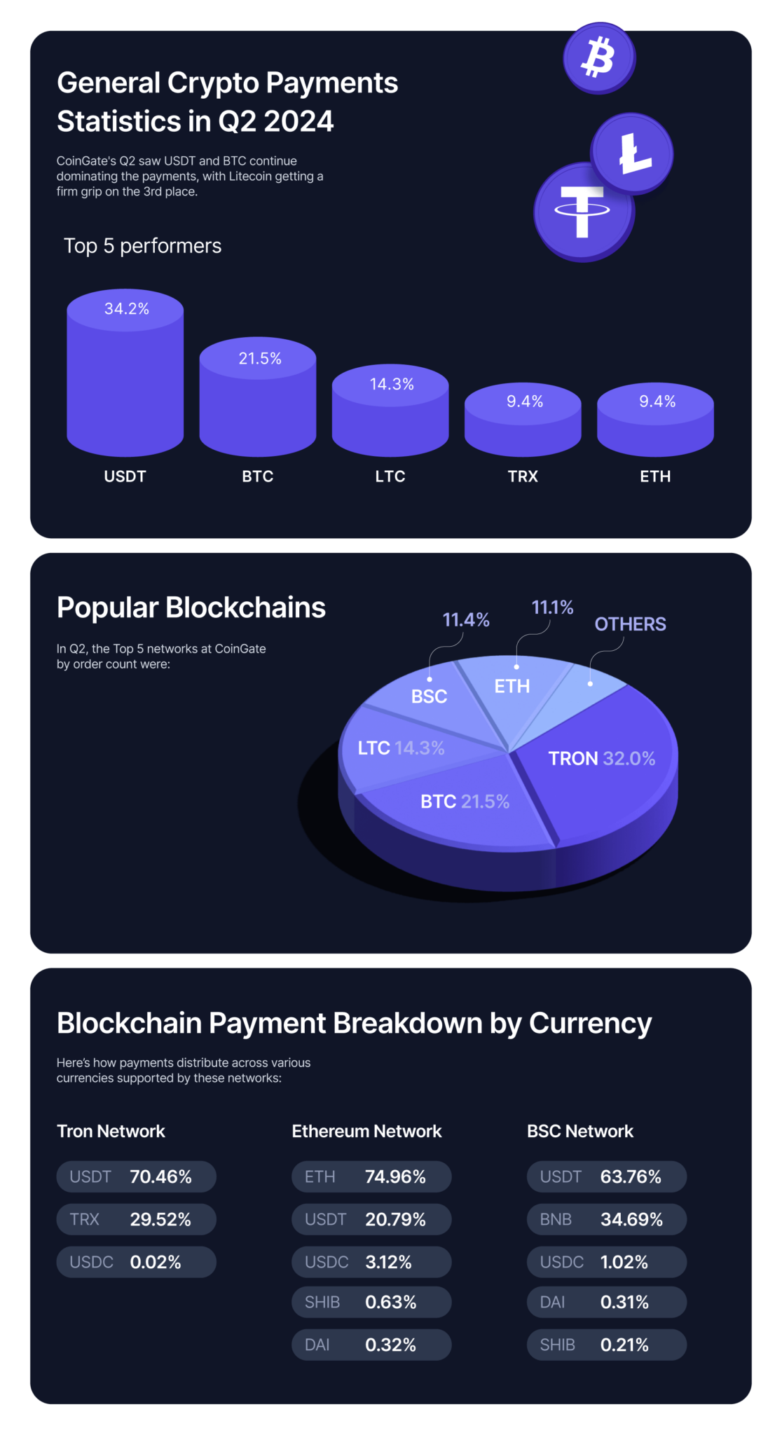 “USDT continúa liderando el grupo en general, representando el 34,2% de todos los pedidos en el segundo trimestre de 2024, aunque todavía se utiliza principalmente en la red TRON”, señaló CoinGate.