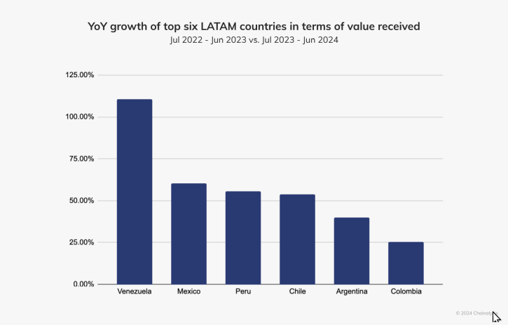 Entre julio de 2023 y junio de 2024, América Latina recibió casi 415 mil millones de dólares en criptomonedas, representando el 9.1% del volumen global. Dentro de esa cifra, las stablecoins concentraron gran parte de las transferencias minoristas, con un crecimiento interanual superior al 40%.