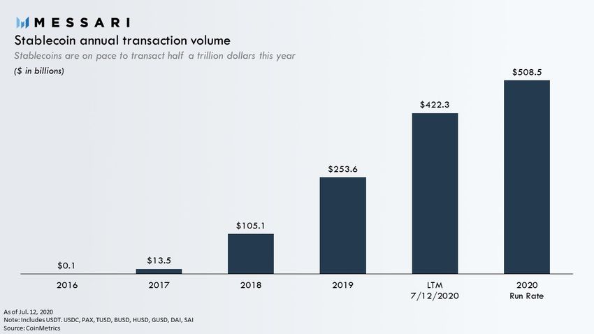 Este crecimiento en las stablecoins es particularmente evidente cuando se considera su uso en blockchains públicas. Para el segundo trimestre de 2020, por ejemplo, las blockchains públicas liquidaron alrededor de 144 mil millones de dólares en transacciones de stablecoins.