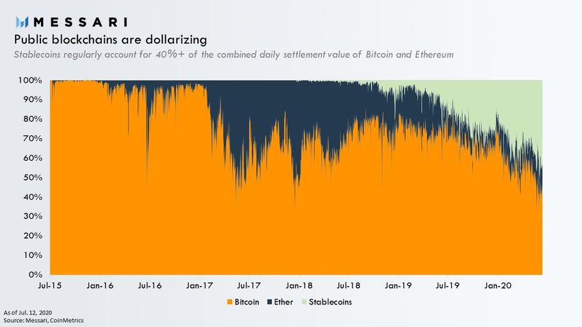 Entre ellos, Ethereum es quizás el más popular. Los datos de Messari muestran que ETH representa el 65% del uso de todas las stablecoins. Además, representa más del 85% del valor de la transacción de stablecoin.