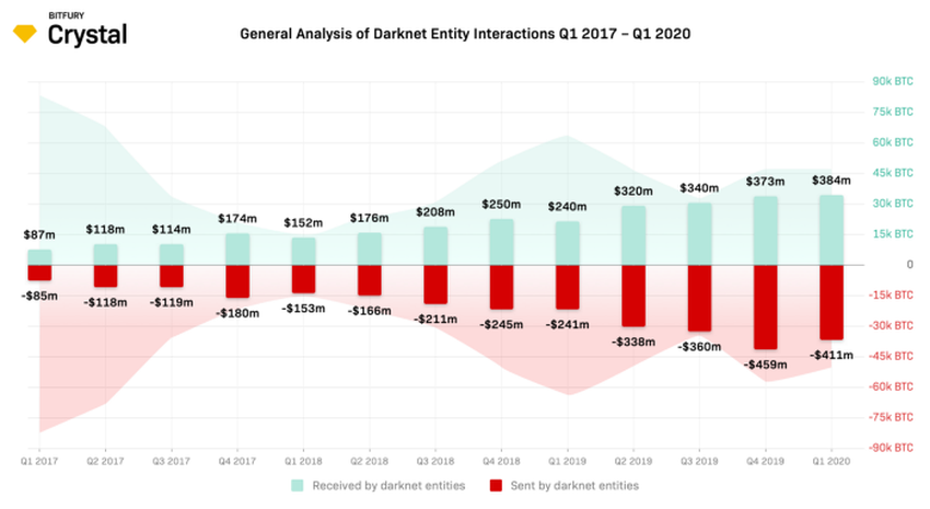 “La proporción de bitcoins enviados de una entidad de la Red Oscura a otra (es decir, todas las transacciones entre diferentes entidades darknet) también creció del 10% en el primer trimestre de 2019 al 19% en el primer trimestre de 2020, lo que indica un crecimiento general en los ingresos y la cooperación de la darknet”.