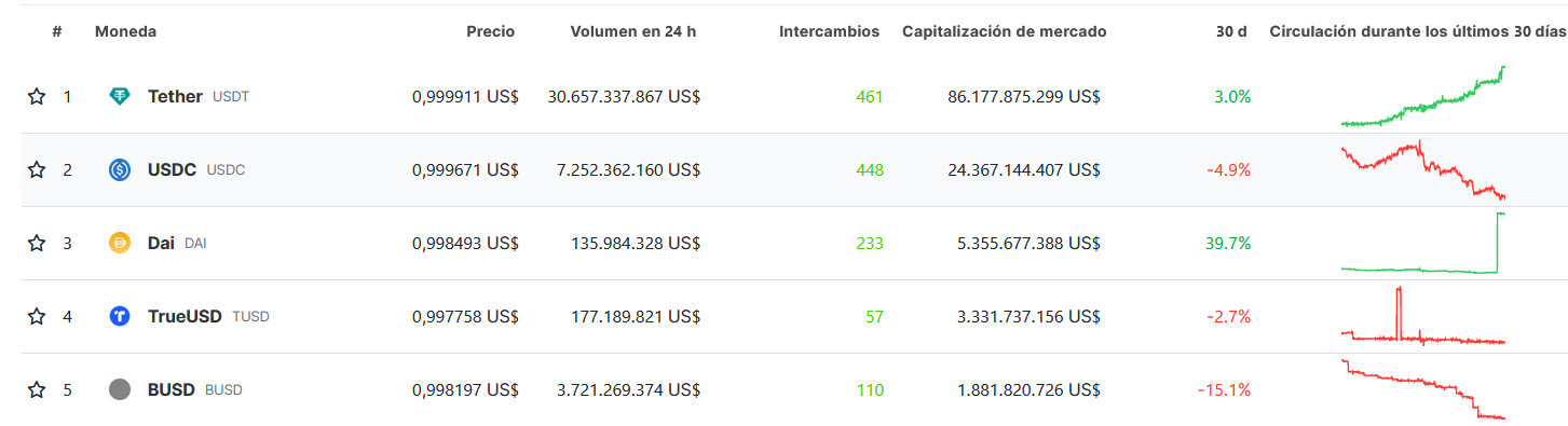 Las stablecoins respaldadas por el dólar estadounidense lideran el mercado, seguidas por el euro, la libra y el yen japonés. Tether (USDT) continúa siendo la principal stablecoin en términos de volumen de operaciones. Tiene una capitalización de mercado de alrededor de 86 mil millones de dólares. Es seguida por el USDC de Circle, con una capitalización de aproximadamente 24.500 millones de dólares.
