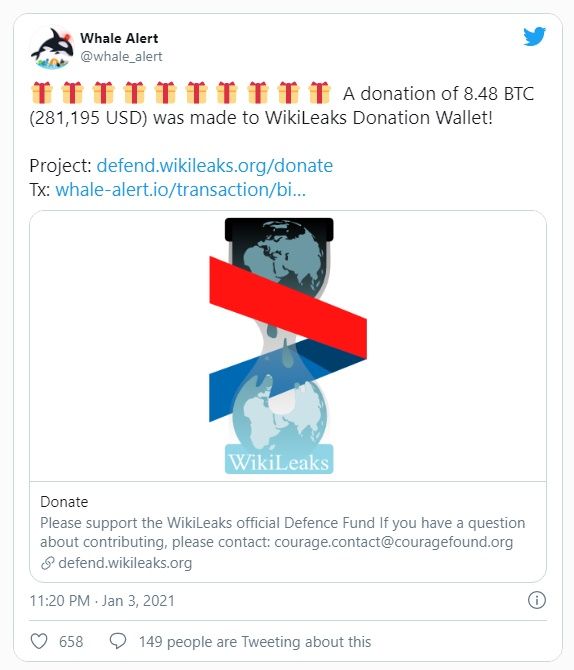 El 4 de enero de 2021, un fanático de las criptomonedas donó 8.48 BTC a la organización internacional sin fines de lucro (NPO) WikiLeaks, específicamente para la defensa de su fundador Julian Assange.
