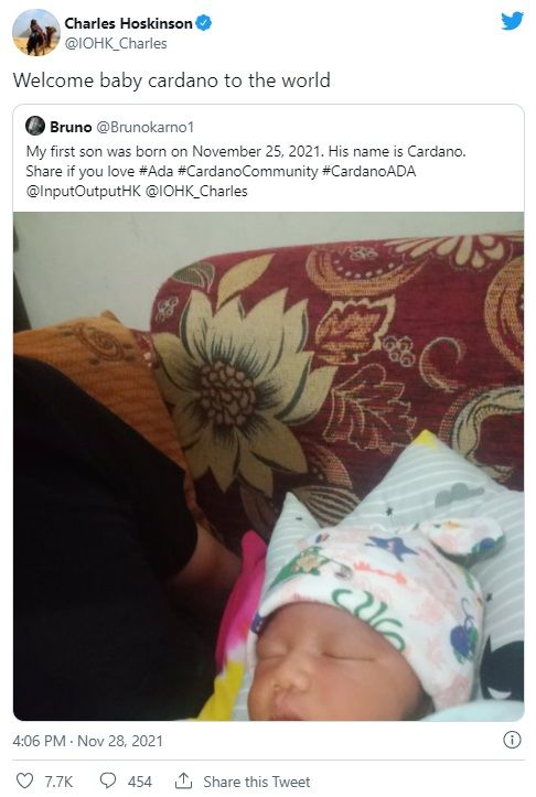 Un usuario nombró a su hijo “Cardano” en honor a la criptomoneda. El anuncio lo hizo en Twitter a través de una publicación con la foto del niño.