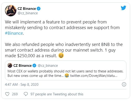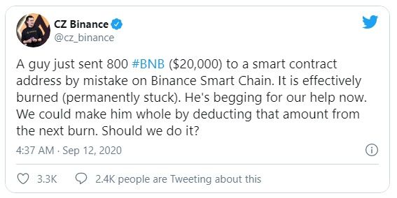 El CEO de Binance, Changpeng Zhao, reveló que un usuario de Binance envió accidentalmente 800 BNB a una dirección de un smart contract de Binance Smart Chain, perdiendo así sus monedas para siempre.