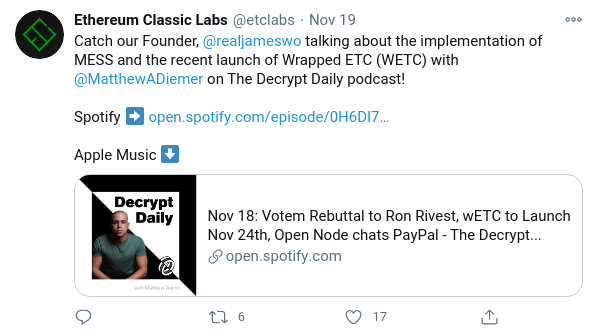 El lanzamiento de WETC sigue al reciente lanzamiento del puente DAI-ETC. Este puente dio a los usuarios de ETC acceso a la stablecoin DAI basada en Ethereum. También sigue la misma plantilla de puente entre cadenas desarrollada por ChainSafe Systems.