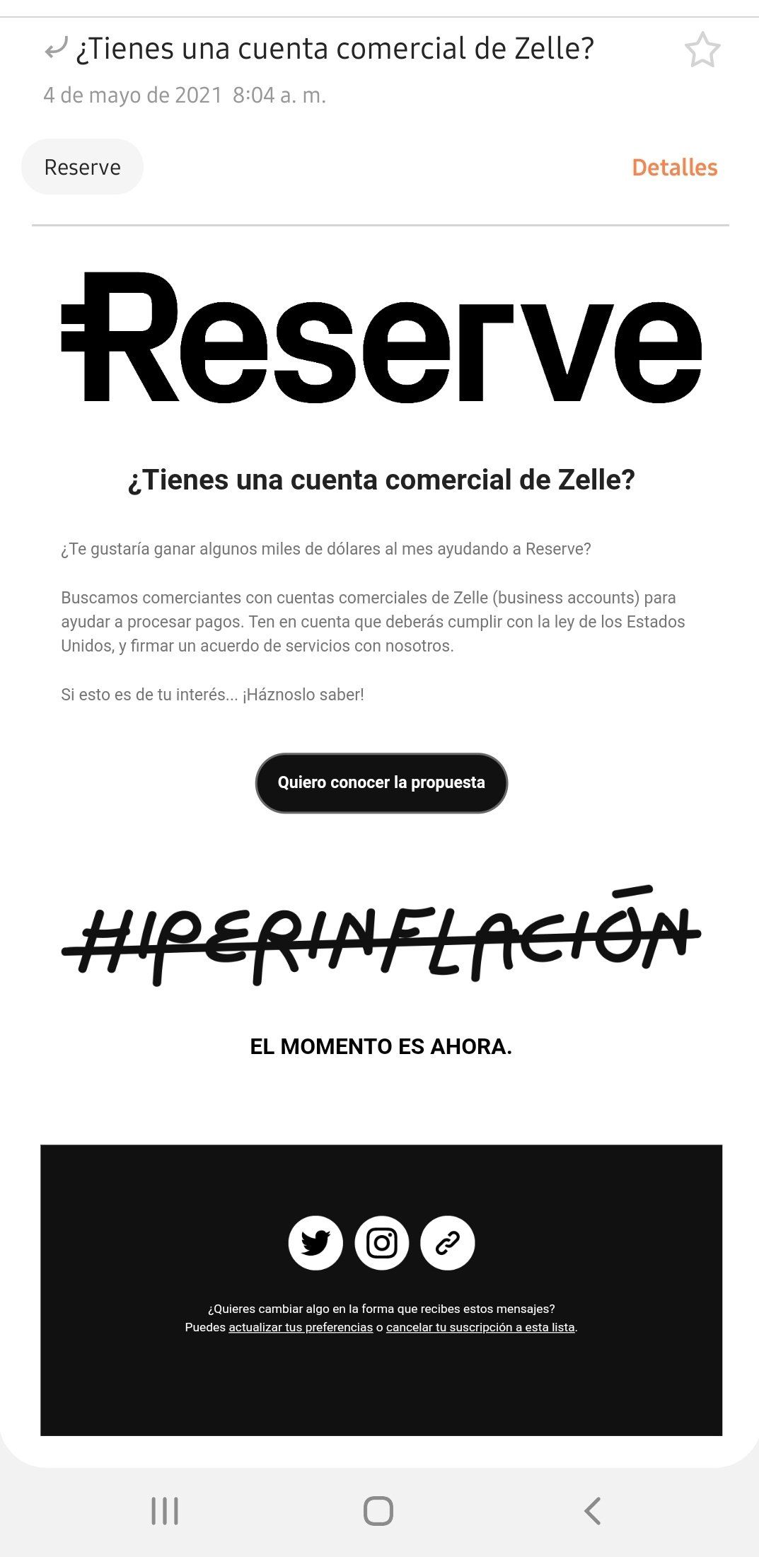 Mediante una publicación en la red social Twitter, una usuaria de Reserve manifestó haber recibido una comunicación masiva de esta compañía con el título de “¿Tienes una cuenta comercial de Zelle?”.