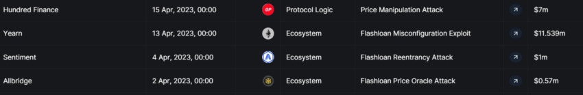 Los protocolos DeFi como Allbridge, Sentiment, Hundred Finance y Yearn Finance sufrieron exploits durante las dos primeras semanas de abril.