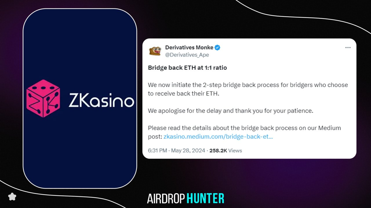 El 28 de mayo, ZKasino declaró que los inversores podían reclamar su Ethereum (ETH) a través de un nuevo “proceso de puente trasero de 2 pasos”. El anuncio se produjo después de que las autoridades holandesas acusaran a la plataforma de robar 30 millones de dólares en depósitos de usuarios.
