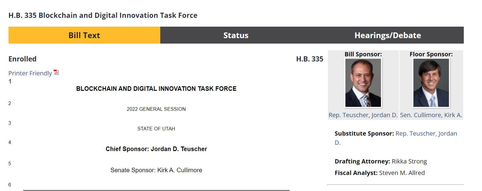 El gobernador firmó el proyecto de ley el 24 de marzo después de varias discusiones al respecto en la Legislatura del Estado de Utah. Con la aprobación, el estado ahora puede establecer un grupo de trabajo para recomendar acciones políticas al gobierno sobre blockchain y tecnologías relacionadas.