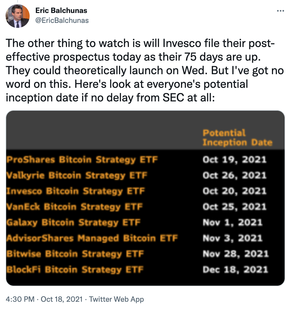 Pocas horas después, James Seyffart, experto en ETF’s para Bloomberg Inteligence, publicaba un documento en Twitter donde se muestra como el fichero del ETF de Bitcoin de Valkyrie tiene como fecha de lanzamiento mañana 19 de octubre, añadiendo: