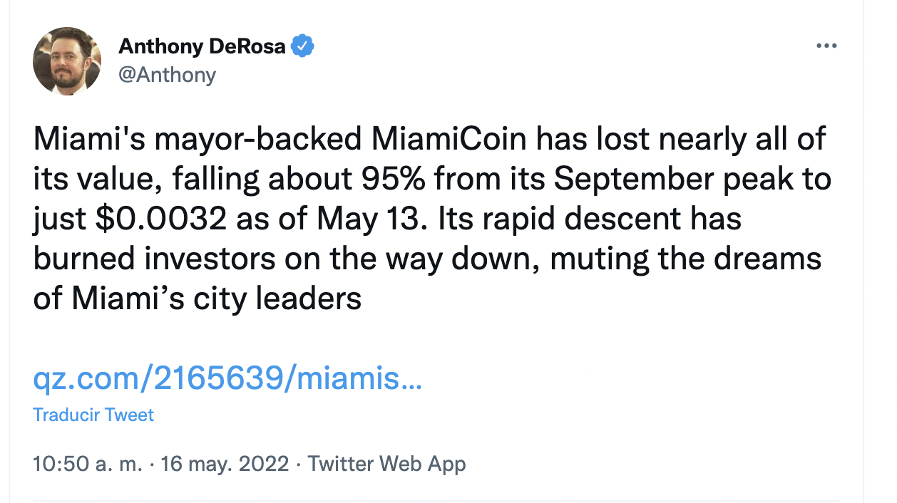 El precio de MiamiCoin ahora ha bajado 99% desde su pico de septiembre de 2021. Una caída de precios tan importante está llamando la atención. MiamiCoin no solo se enmarcó como la primera CityCoin en ingresar al mercado cripto, sino que también fue respaldada por el propio alcalde de Miami, Francis X. Suarez.