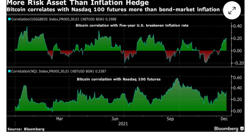 La controversia sobre el papel atribuido falsamente a Bitcoin en los monederos de inversión continúa creciendo. Los defensores argumentan que ofrece protección contra algunas de las tasas de inflación más altas en una generación. Pero el token en 2021 tendió a correlacionarse con activos de riesgo como las acciones de tecnología en lugar de las expectativas de inflación.