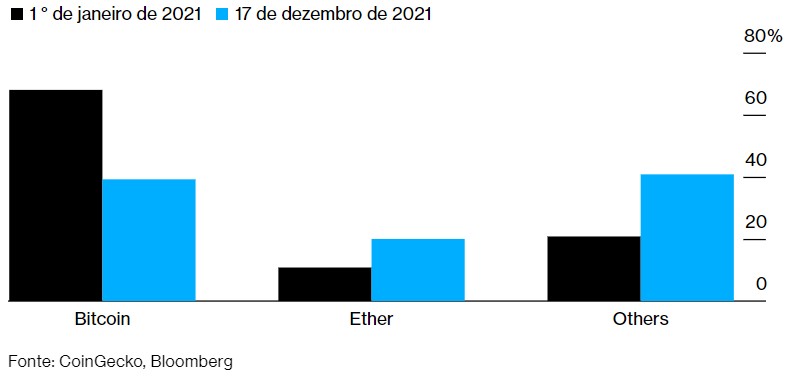 La participación de Bitcoin en el mercado de criptoactivos se redujo drásticamente a lo largo de 2021 a medida que se dispararon otros tokens, una señal de cómo el interés de los inversores en los activos digitales se ha ampliado a pesar de, o quizás debido a, una volatilidad masiva.