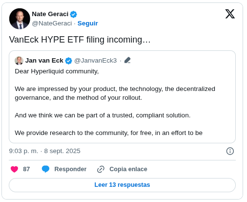 Su publicación inmediatamente desató rumores de que VanEck estaba preparando un ETF de HYPE. Nate Geraci, presidente de la ETF Store, se refirió a esta posibilidad.