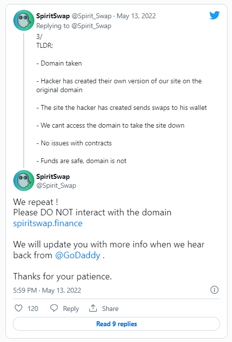 En el caso de SpiritSwap, el atacante pudo “modificar la interfaz para desviar fondos a un monedero bajo su propio control”. En este caso, el atacante pudo llevarse 18,000 dólares.