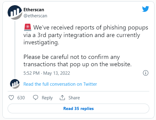 En un incidente separado, CoinGecko y Etherscan fueron hackeados a través de un servicio de terceros. CoinGecko dijo que el ataque de phishing fue el resultado de un script publicitario malicioso de la red de publicidad cripto Coinzilla. Etherscan también dijo que la integración de un tercero fue la causa.