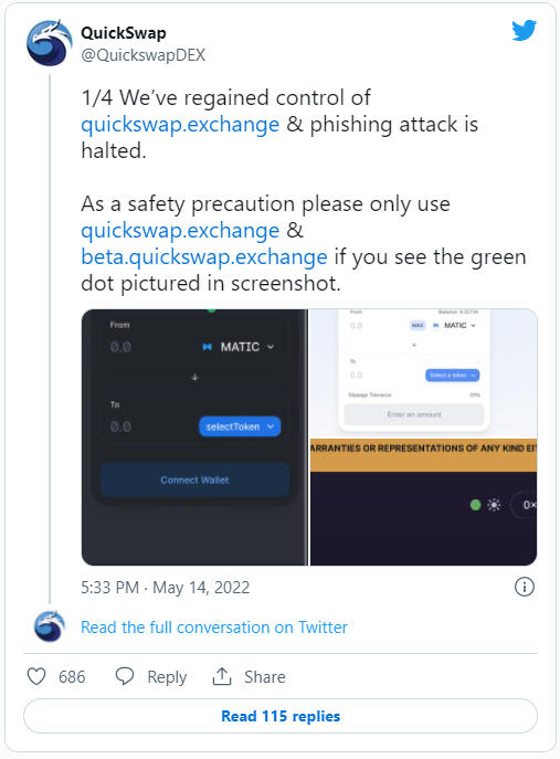 Varias plataformas de criptomonedas están reanudando su funcionalidad tras un ataque que tuvo lugar a través de un exploit de GoDaddy a finales de la semana pasada. Las plataformas afectadas incluyen SpiritSwap, QuickSwap y Dextools.