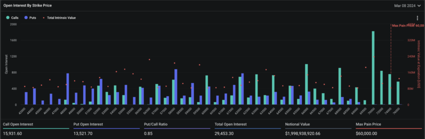 Un total de 1.826 contratos call a un precio de ejercicio de 70,000 dólares indican un creciente sentimiento alcista entre los traders de derivados. El punto de dolor máximo está en 60,000 dólares, que está bastante lejos del precio actual.