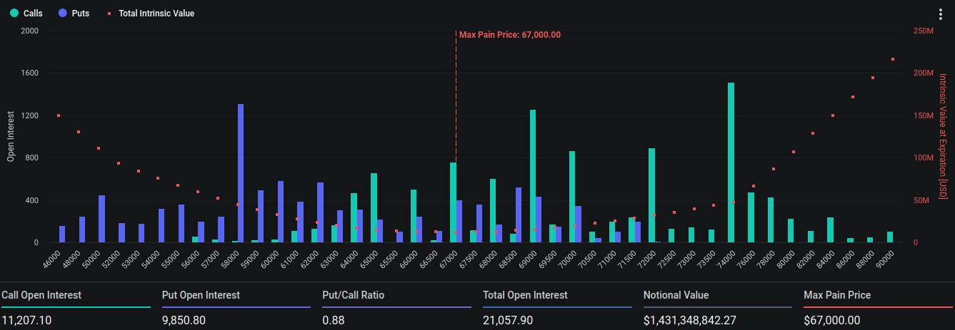 Además de las opciones de Ethereum, también expirarán 21,057 contratos de Bitcoin. Estos tienen un valor nominal de más de 1,43 mil millones de dólares, una relación put/call de 0.88 y un punto máximo de dolor de 67,000 dólares.