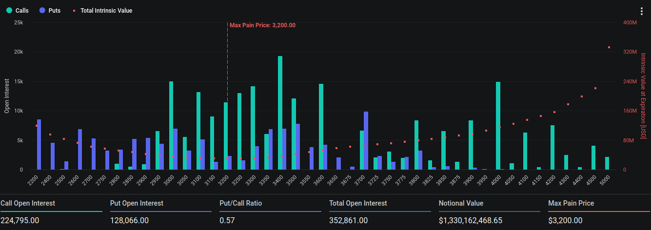 El valor nominal de los 352,861 contratos de Ethereum que expirarán se ubica en 1,33 mil millones de dólares. Los datos de Deribit señalan que la relación put/call de Ethereum se ubica en 0.57. Esta cifra señala una prevalencia de opciones de compra (calls) sobre las de venta (puts).