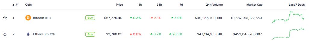 Por su parte, el precio de Bitcoin cotiza actualmente en 67,775 dólares tras caer 2.1% en las últimas 24 horas.