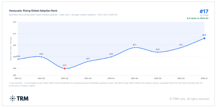 - Venezuela escaló del puesto 22 al 17 en el ranking global de adopción cripto de TRM Labs durante el Q1 2026.