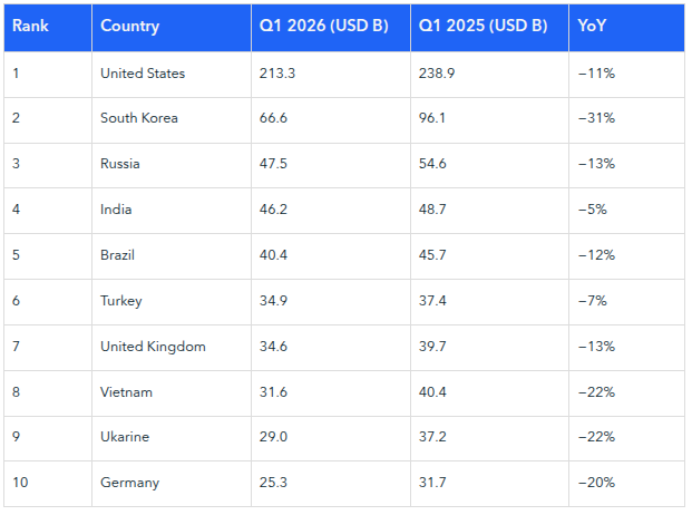 Bitcoin acompañó esta tendencia con una caída del 22% durante el trimestre, cerrando cerca de los 68,000 dólares. Estados Unidos retuvo el primer lugar con 213 mil millones, aunque cayó 11% interanual. Corea del Sur, Rusia, India y Brasil completaron los primeros cinco puestos del listado.