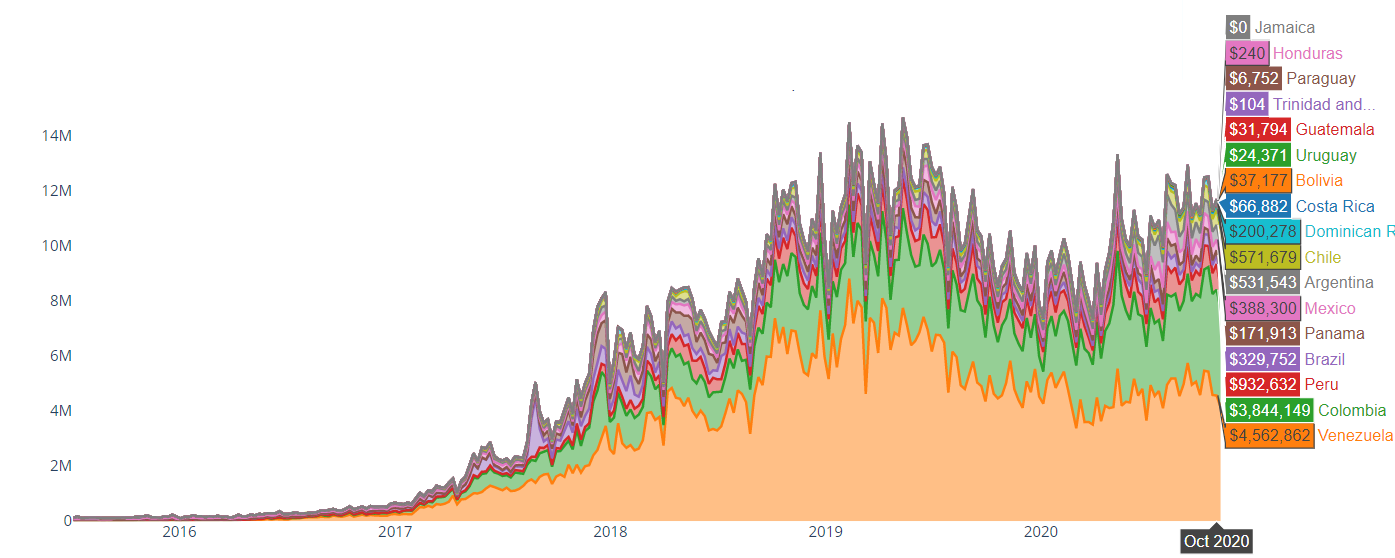 “Venezuela es una economía pequeña en América Latina, pero la hiperinflación en el país ha hecho que el volumen de intercambio de Bitcoin aumente considerablemente en el país. Esto también influye en el volumen en su país vecino, Colombia.”