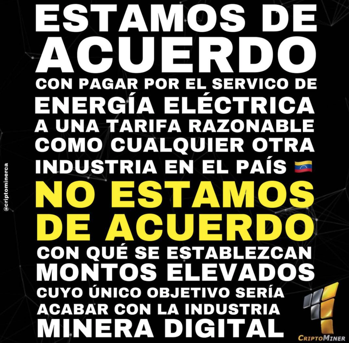 - Solicitar a CORPOELEC apoyo para el desarrollo nacional a través de la industria de la Minería Digital, pidiendo de esta forma un cese de la persecución, cortes ilegales, señalamientos y criminalización de la actividad como responsable de las fallas y deterioro del Sistema Eléctrico Nacional.