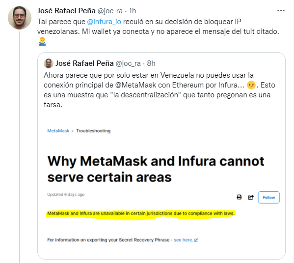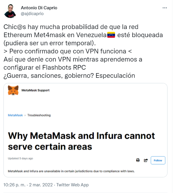 “Venezuela fue privado de MetaMask por las sanciones a Rusia. Resulta que utiliza un servicio entre MetaMask y la blockchain llamado proveído por Infura. Parece que ya han habilitado nuevamente a Venezuela pero esto sirve para darnos cuenta lo centralizado que es todo”.
