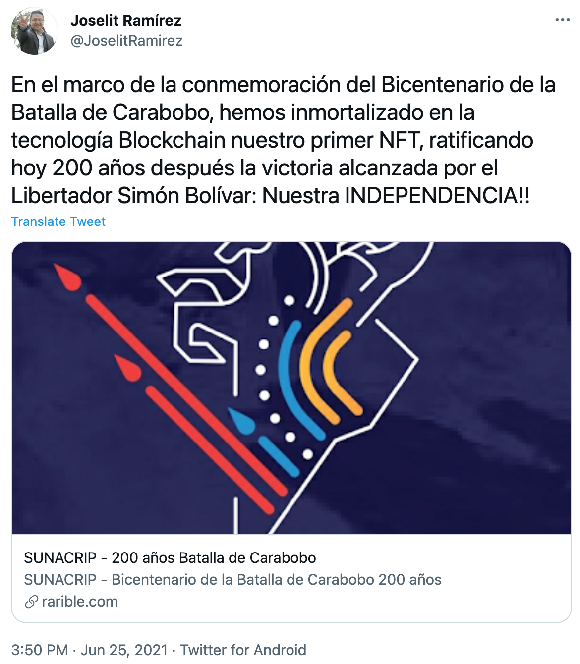 Este 25 de junio de 2021 Venezuela ha anunciado el lanzamiento de su primer NFT como país, en el globalmente conocido Exchange de NFT´s Rarible. La noticia se fue dada a conocer por Joselit Ramírez, superintendente nacional de criptoactivos en el país latinoamericano en su cuenta twitter, donde ha señalado que su creación ha sido motivo de la conmemoración del Bicentenario de la Batalla de Carabobo.