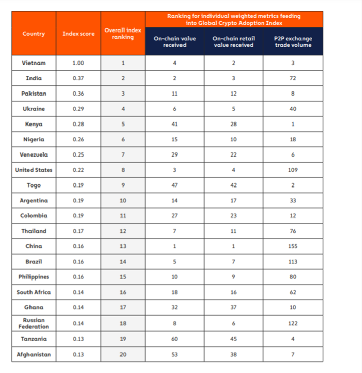 La metodología que utiliza la consultora este año, para clasificar a estos países en el ranking de los 20 países que más utilizan e invierten en criptomonedas, tomó en cuenta 3 clases de transacciones: