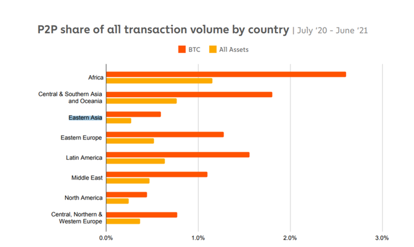 Sin embargo, a pesar de estar entre los mercados más pequeños, América Latina muestra una fuerte adopción con tendencia al crecimiento. Pero esta porción pequeña de mercado, parece revertirse cuando se analizan las métricas del mercado p2p de Latam, en donde supera a Estados Unidos, Europa y Asia Oriental.