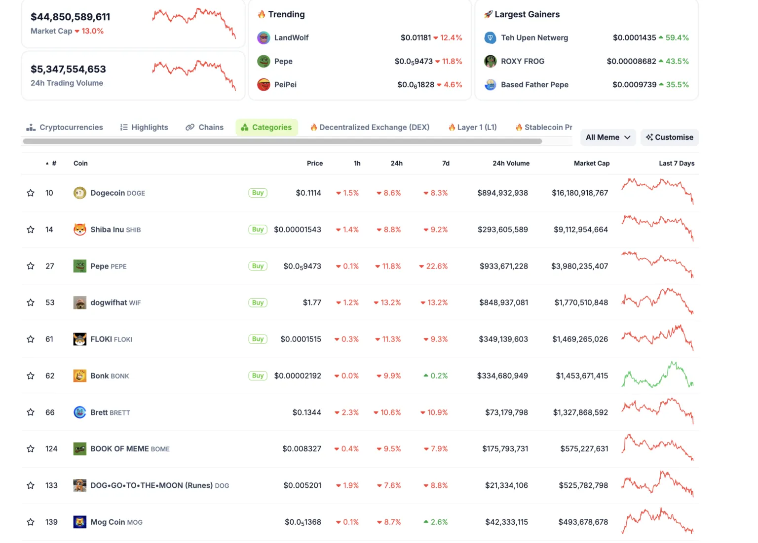 Actualmente, el sector de las memecoins ha disminuido aproximadamente un 13% en las últimas 24 horas. WIF, entre las 10 principales memecoins, experimentó la caída más significativa, disminuyendo un 13.2%. Por el contrario, memecoins como Dogecoin (DOGE) y DOG•GO•TO•THE•MOON han enfrentado impactos menos severos, con reducciones del 8.6% y 7.6% respectivamente.