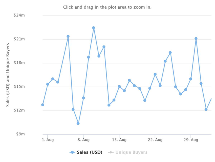 Los 495,666 compradores únicos de agosto de 2022 y el valor de venta promedio de 132,33 dólares representaron una caída del 19% y del 87%, respectivamente, con respecto a las cifras históricas del año pasado.