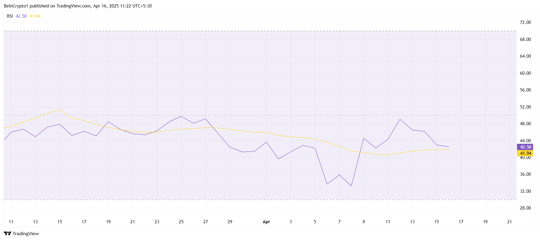 Indicadores técnicos como el Índice de Fuerza Relativa (RSI) reflejan el sentimiento negativo que rodea a Cardano. A pesar de acercarse brevemente a la zona alcista, el RSI no logró cruzar la línea crítica de 50, señalando que el momentum no ha cambiado a favor de una recuperación.