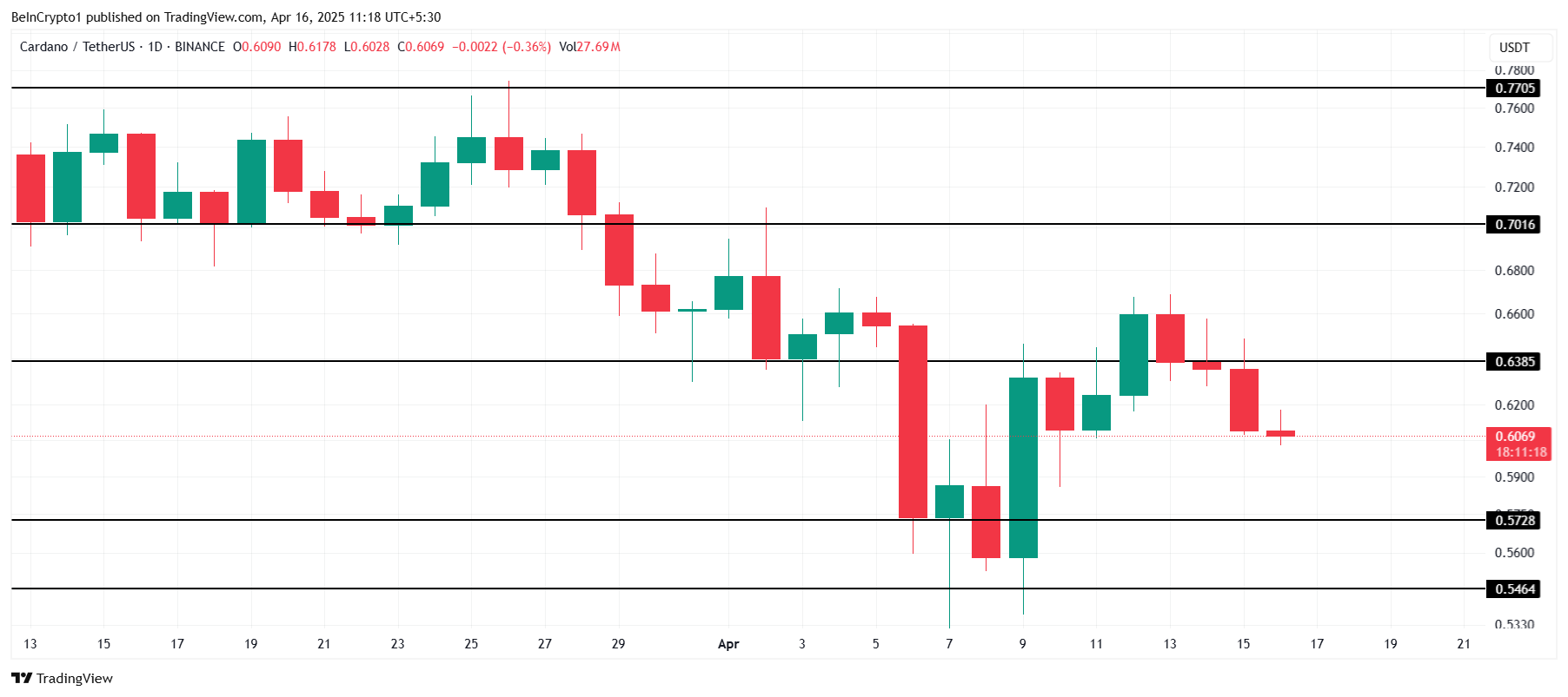 A 0.60 dólares, Cardano no ha logrado asegurar 0.63 dólares como un nivel de soporte crítico, lo cual tuvo la oportunidad de hacer anteriormente.